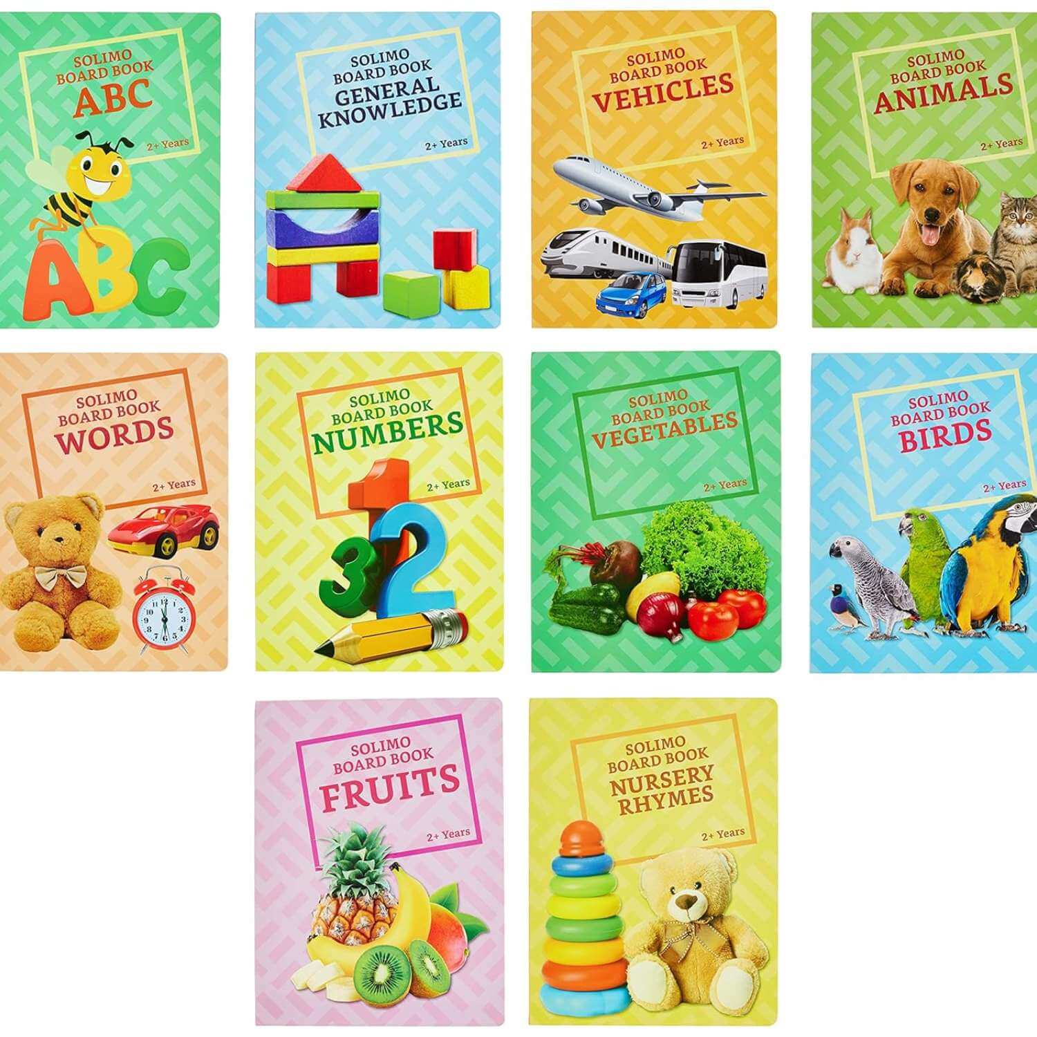 Long Board Books for Kids. This set comprises of 10 multicoloured picture books which include Alphabets, Fruits, Numbers, Vegetables, Words, Animals, Birds, Vehicles, General Knowledge, and Nursery Rhymes. These books are an ideal for help your child take their first steps into the realm of language and learning. They will allow them to learn colours, numbers and other fundamentals. These hardcover books are designed with thick paperboard with a premium glossy finish, making it sturdy for rough usage.